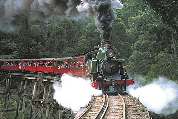 Ride on Australia's most notable narrow gauge railway through the spectacular Dandenong Ranges with bellbirds and kookaburras echoing the steam train's whistle. Take in the beauty of Sherbrooke Forest and visit the quaint mountain village of Sassafras.
